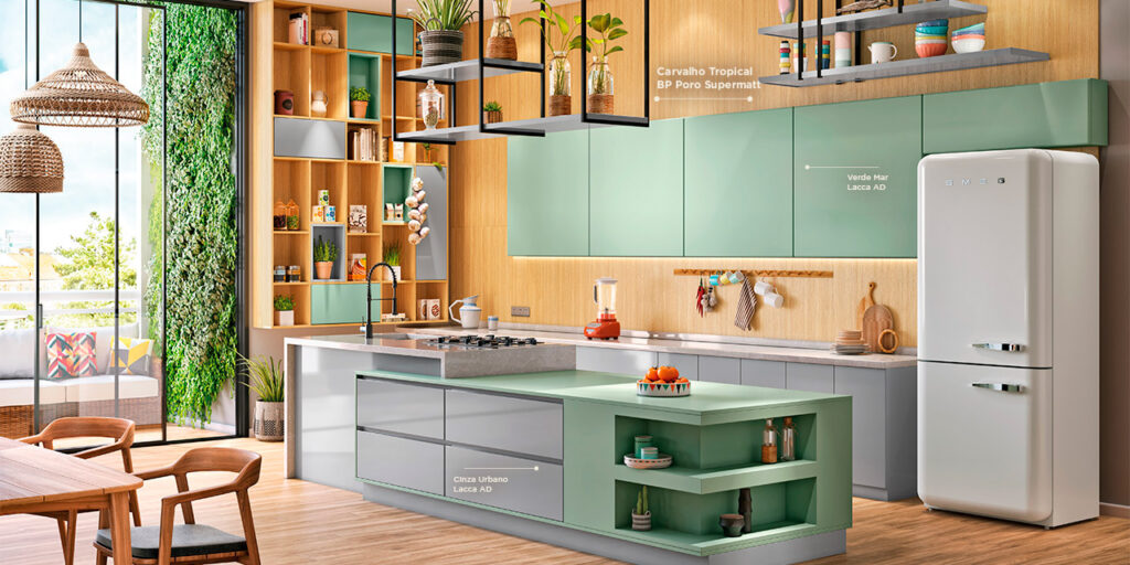 O seu tom minimalista e harmônico é ótimo para combinar com padrões que remetem aos elementos da natureza, como é o exemplo da foto de capa, em que o Carvalho Tropical está aplicado no mesmo espaço que o Verde Mar.