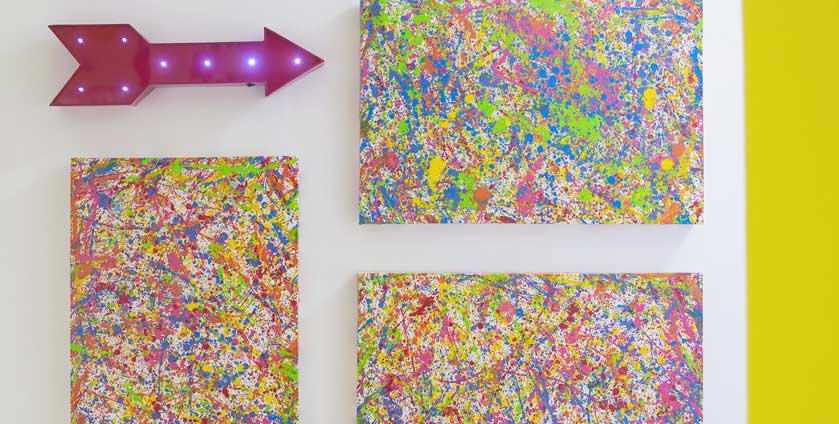 Uma ótima ideia para ter parede branca no corredor, é pintar as portas com Tintas Eucatex de cores fortes e distintas, além de utilizar um mega lambe-lambe emoldurado encostado no chão. Fica super cool e estiloso.