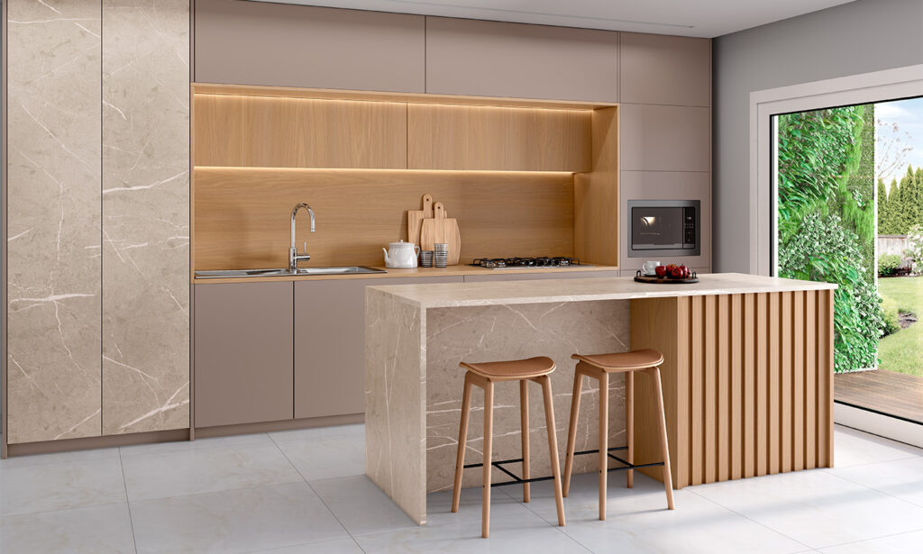 A tonalidade do Cinza Urbano é sóbria e minimalista, acompanha estilos industriais e é ótima para quem busca cores mais modernas e elegantes. Já o Quartzo Bege destaca a beleza do mármore clássico, que apresenta o efeito da pedra polida, com destaque para a delicadeza dos veios espaçados.