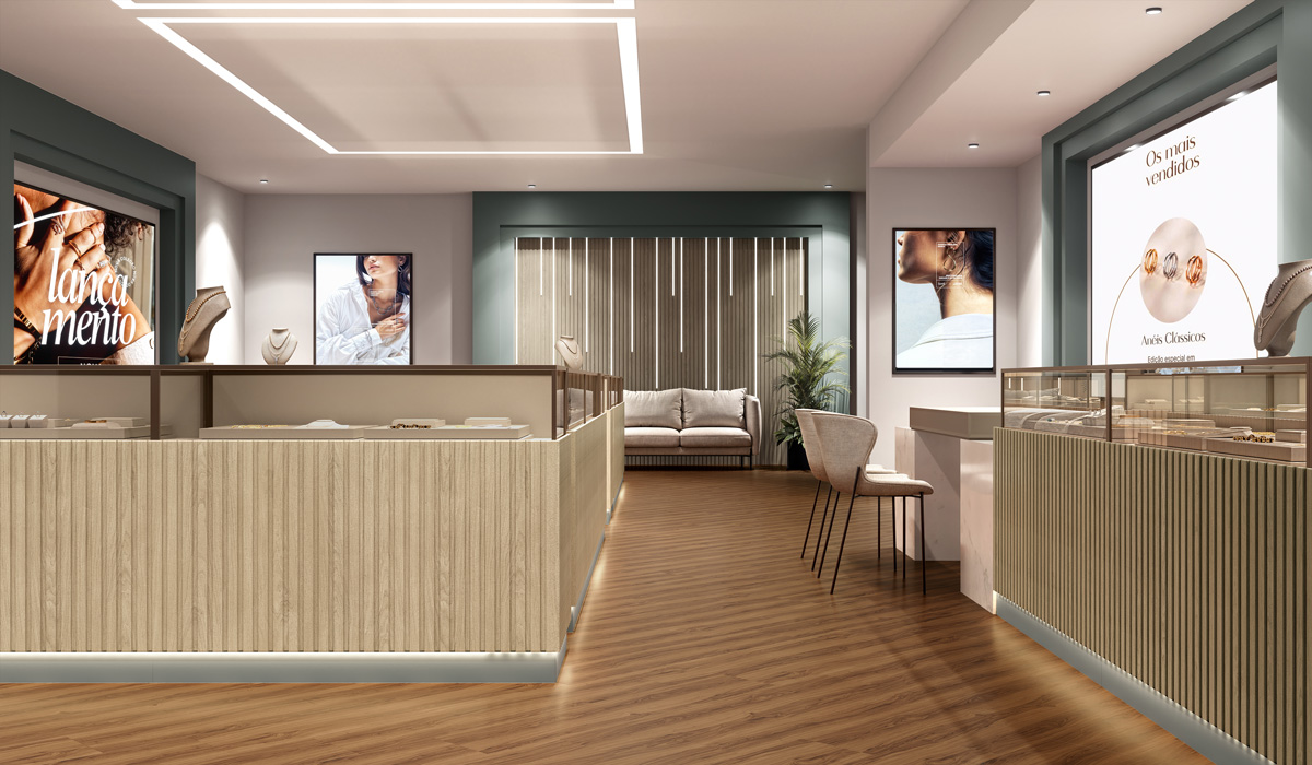 Em mais uma opção de amadeirado, desta vez trazemos o padrão Canyon aplicado em uma loja de joias, refletindo elegância e requinte. Essa opção apresenta uma superfície um pouco mais intensa que o Brisbane, mostrado no início do texto, com nuances da madeira que também se destacam na superfície.