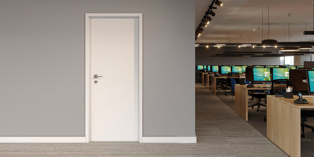 Na foto mostrada acima, o padrão está presente na porta Eucaplac, aplicada em um espaço corporativo, levando um toque de luminosidade e contrastando com a sobriedade do restante do ambiente. Para combinar com a porta e proporcionar um acabamento perfeito, o Rodapé Acqua New, na mesma tonalidade, foi o escolhido.