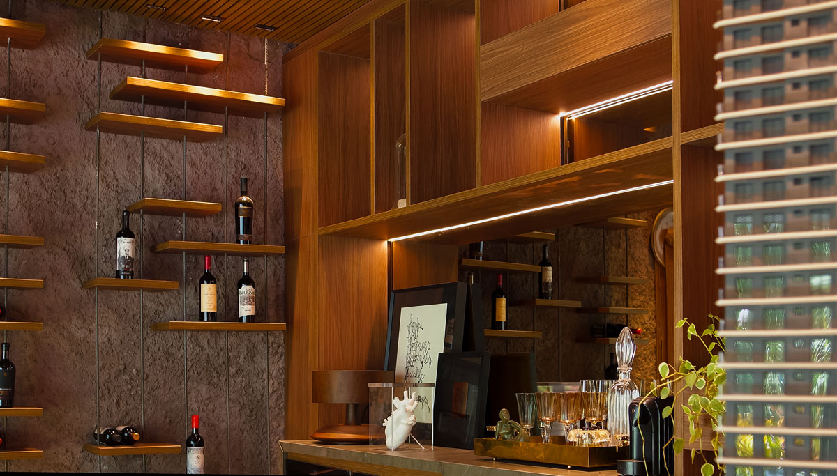 O ambiente é perfeito para receber amigos e degustar um bom vinho em um momento de relaxamento e descontração. Para reforçar essa estética de sofisticação e elegância, o padrão de MDF escolhido foi o Imbuia Caiapó, também no acabamento BP Poro SuperMatt, um amadeirado de tonalidade intensa e escura, inspirado na árvore nativa imbuia e nos povos originários.