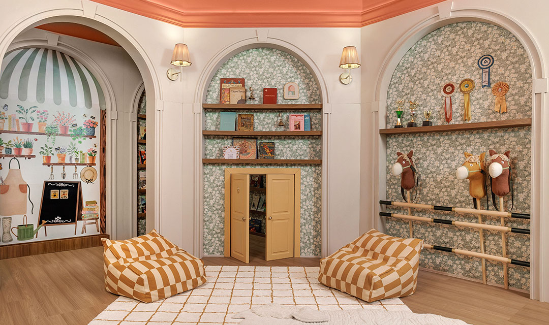 A designer se inspirou em suas próprias experiências para criar esse dormitório que transformou uma biblioteca repleta de história e imaginação em um quarto criativo e aconchegante, pensando na trajetória de uma avó que se prepara animada para receber de braços abertos sua amada neta.