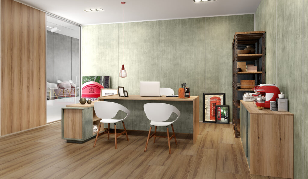 As madeiras em tom médio são super versáteis para compor a decoração dos ambientes, pois ao mesmo tempo que agregam aconchego, são fáceis de combinar e trazem um aspecto de sofisticação e imponência ao projeto. O padrão Nogueira Terra da linha de Divisórias Novitá é uma ótima escolha para quem deseja trazer um toque de calor aos espaços corporativos, pois tem um tom levemente dourado, com veios suaves, alternados a traços mais fortes, que criam um conjunto harmonioso e equilibrado.