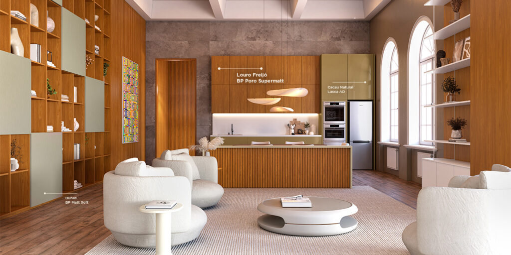 Inspirado na essência das madeiras nativas, em especial às da região Norte do país, mais especificamente da Amazônia, a estrutura de catedrais suaves e naturais exala a essência e a textura real das madeiras devido ao acabamento Poro Supermatt, com veios lineares com superfície matt e profundidade mínima.