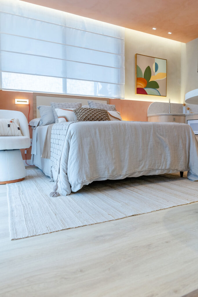 Para trazer essa suavidade, o piso escolhido foi o Phoenix, da Linha Basic de pisos vinílicos, um amadeirado bem claro combinado ao Rodapé Estilo, no padrão Branco Max sem friso, para deixar o acabamento ainda mais discreto.