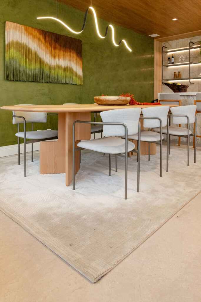 Com cores, texturas e a materialidade carioca presente na decoração, os produtos escolhidos foram o piso vinílico Miami, da Linha Basic, um amadeirado cinza claro e suave, junto ao rodapé no Branco Max, da Linha Rodapé Acqua New.