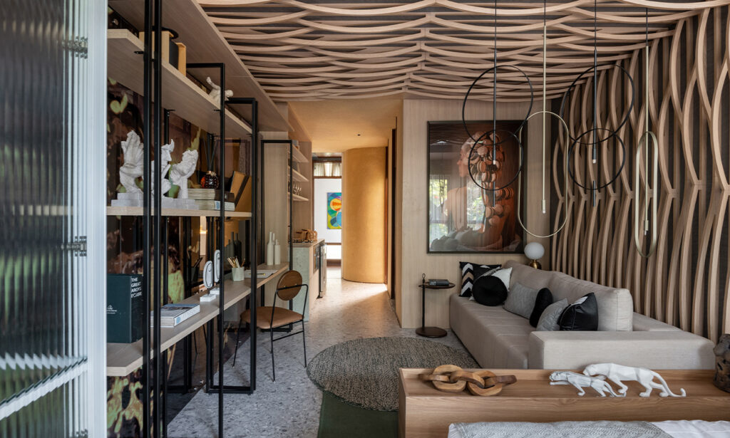Entre os ambientes, está o criativo Estúdio Executivo Cosmopolita, da arquiteta Susana Damy, que projetou um apartamento completo, criativo, funcional e moderno. Logo na entrada do ambiente, ela utilizou o Ripado Eucatex em barras de encaixe na tonalidade Noce Oro, para deixar o ambiente mais confortável.