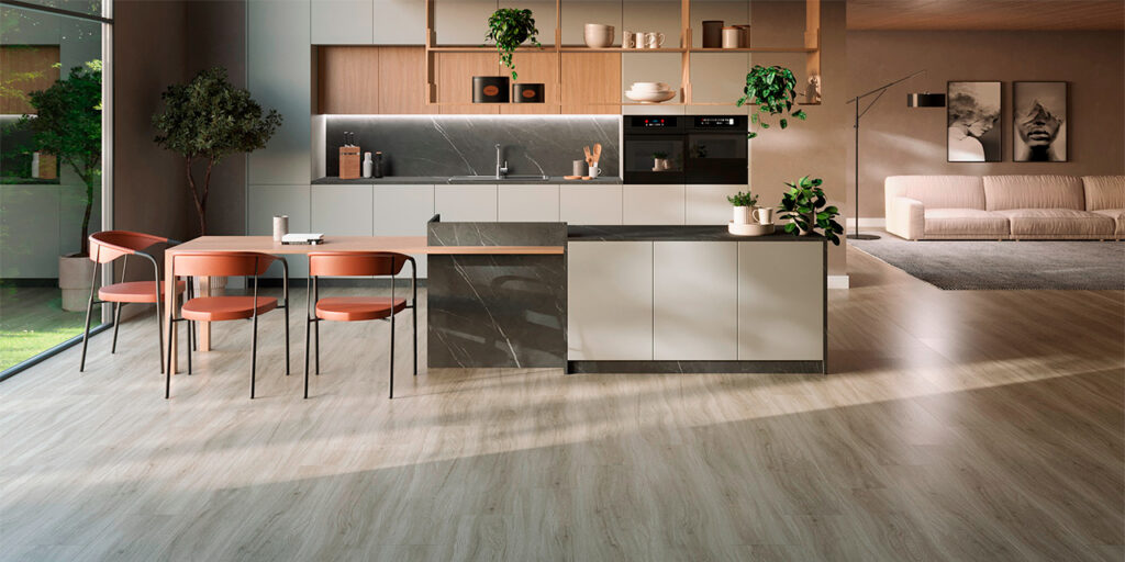 Os novos pisos vinílicos Eucafloor apresentam três padrões amadeirados com muita beleza e personalidade. No espaço integrado acima, o padrão escolhido é o Buenos Aires, que possui uma tonalidade acinzentada discreta e suave, ideal para diversos ambientes.