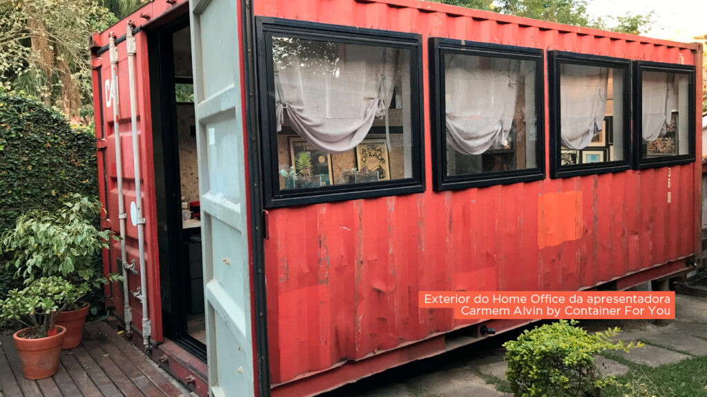 O container de 14m² foi instalado no quintal da casa existente, e além de atender a necessidade de um home office, com mesas de trabalho, foi pensado para servir de espaço para a gravação de conteúdo para o programa de TV e redes sociais. Por isso, a escolha de acabamentos com desempenho acústico e térmico foi super importante, pensada em conjunto com as soluções de ventilação cruzada e grandes janelas em uma das faces, para trazer iluminação natural ao espaço.