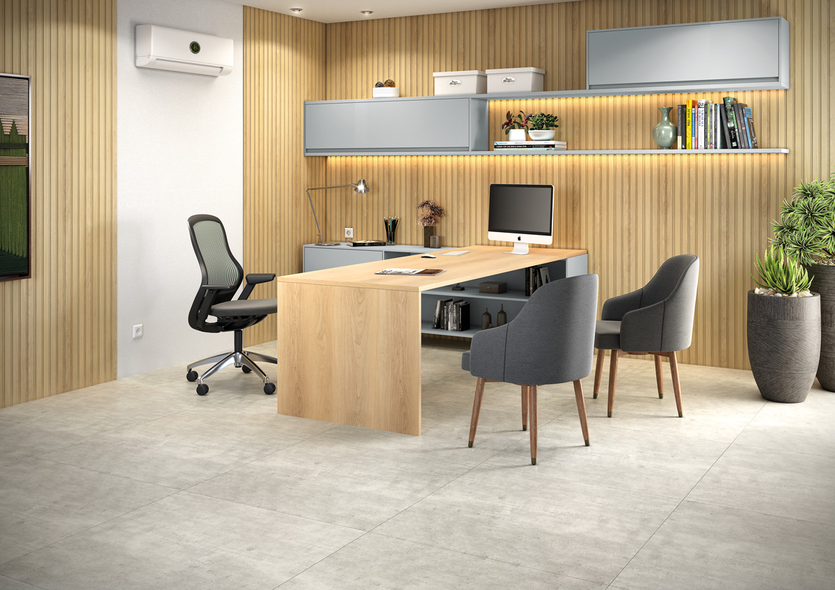 No ambiente, ele está compondo com a mesma tonalidade de MDF Eucatex, disponível na Linha BP Raízes. A combinação entre os dois produtos fez toda a diferença para que esse espaço ficasse neutro e funcional, sem perder a identidade e a personalidade do profissional que utiliza a sala.