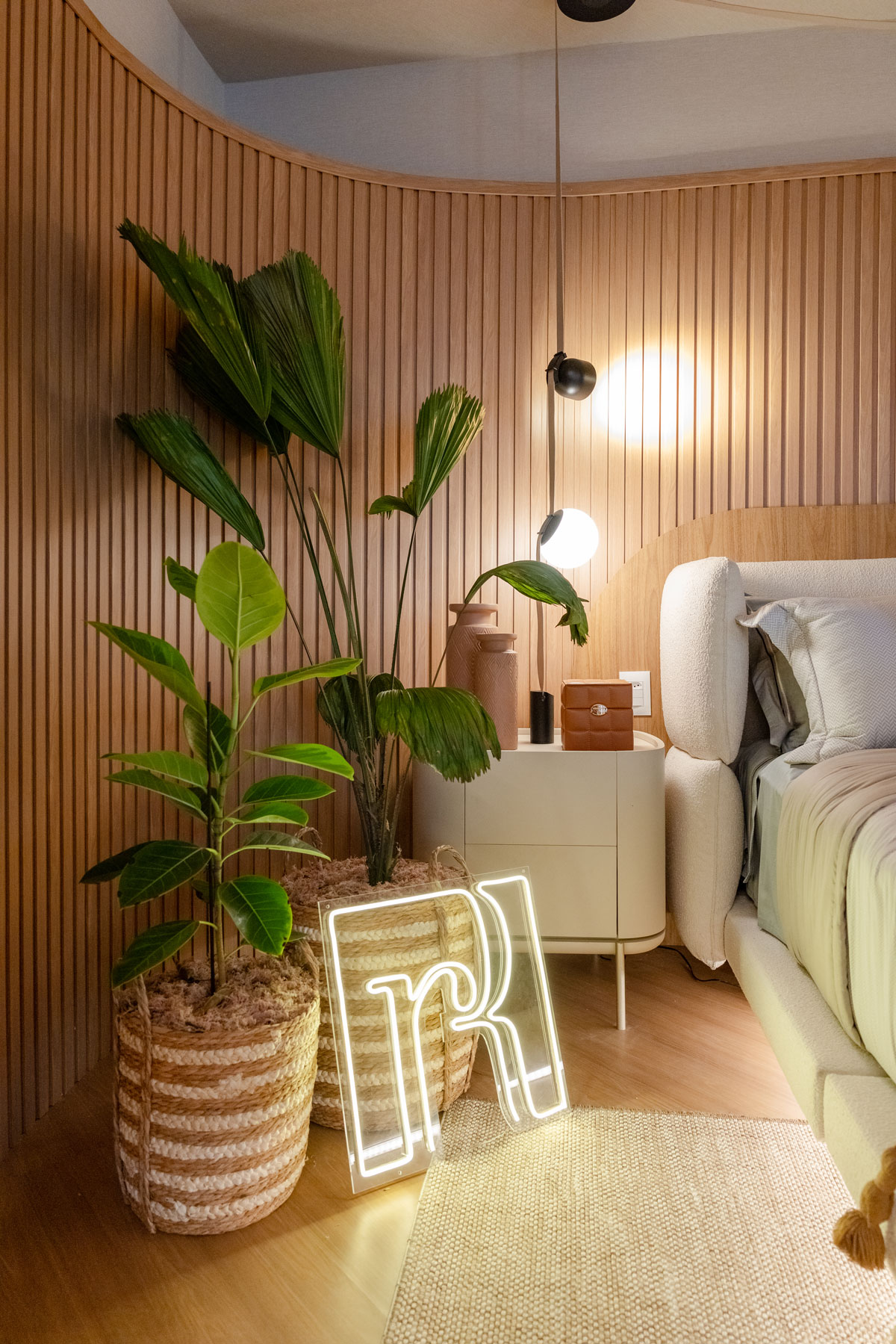 O ambiente busca trazer a sensação de equilíbrio, calmaria e tranquilidade, com elementos decorativos de plantas, palhas e fibras remetem às decorações litorâneas. A tonalidade escolhida do ripado, combinou perfeitamente com o conceito que os ambientes buscam proporcionar.