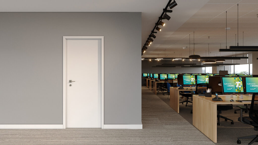 Na foto de capa desta matéria, temos a Porta Eucaplac Branco Max aplicada em um escritório com mesas compartilhadas. O produto se destaca entre os tons de cinza e amadeirados do ambiente.