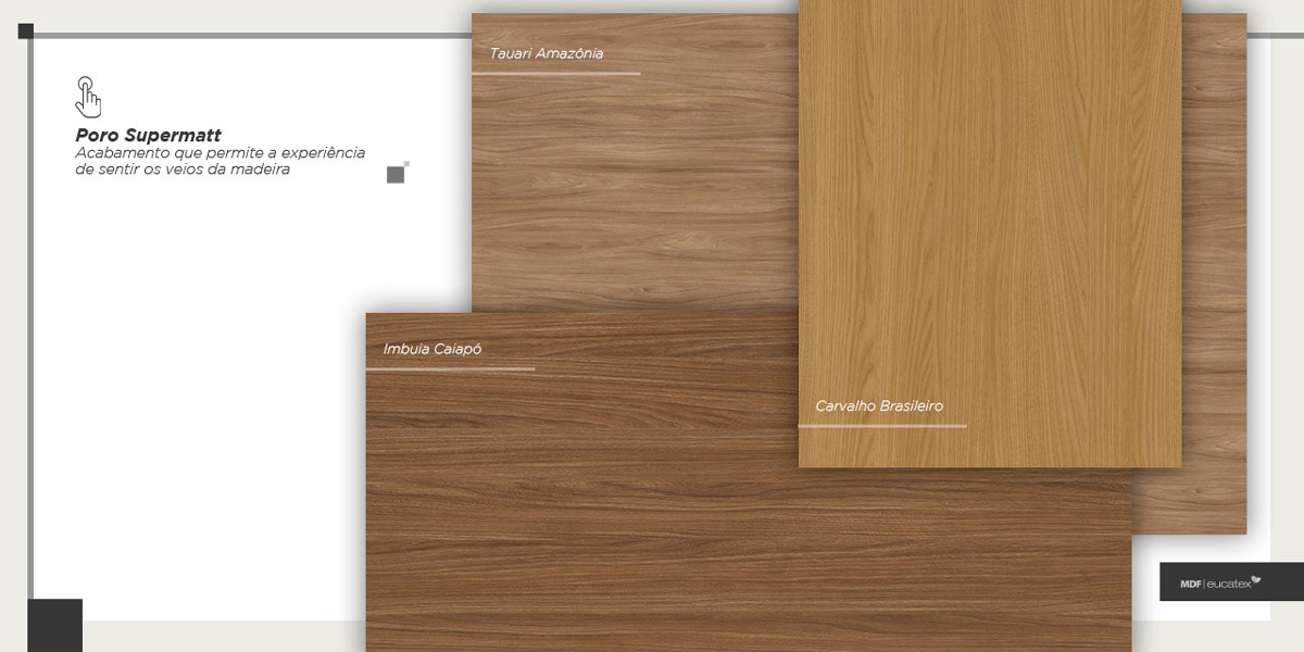 Além de levarmos nossos pisos vinílicos, laminados, rodapés Eucafloor, painéis de MDF e ripados, lançamos na feira a coleção MDP Perffect Riquezas do Brasil, com 12 novos padrões que trazem diferentes texturas e cores típicas que remetem à natureza brasileira.