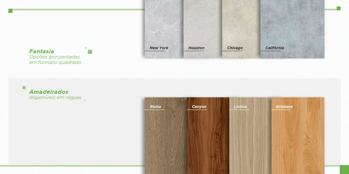 A nova linha apresenta quatro padrões acinzentados e quatro amadeirados, que são muito versáteis para combinar com diferentes decorações.