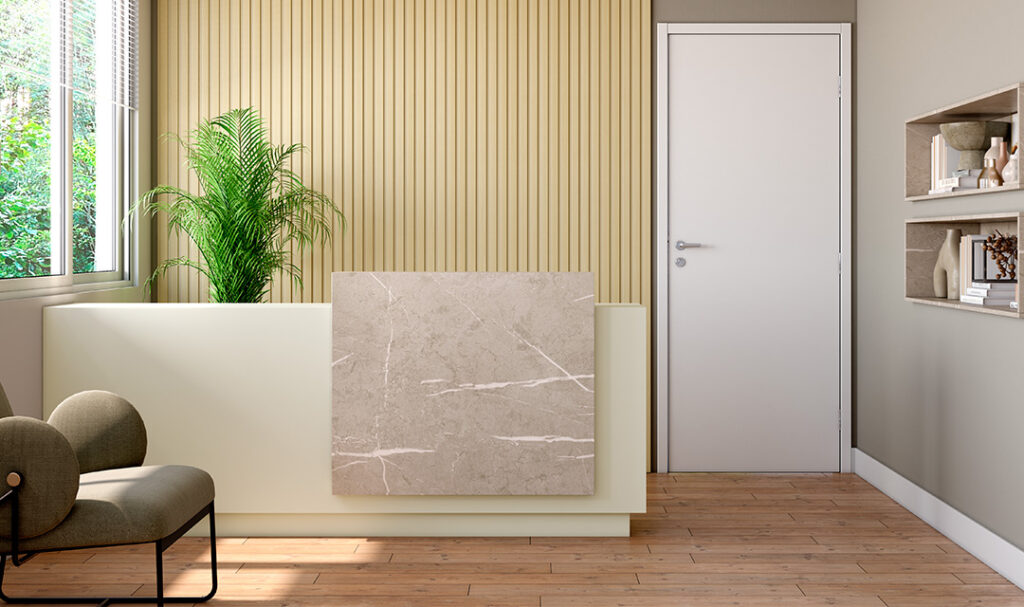 Na recepção ilustrada na foto de capa, temos um padrão suave e discreto, o Legno Crema, uma tonalidade levemente amarela, que remete aos veios suaves da madeira. O destaque está entre as ripas, com um tom de marrom mais escuro.