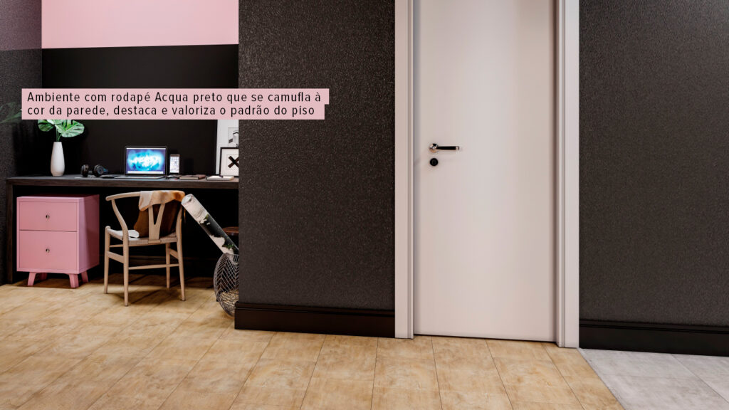 Ao escolher o rodapé ideal para o projeto, o primeiro ponto é pensar se ele vai ser utilizado em área úmida ou seca, pois essa característica vai determinar qual tipo de material pode ser utilizado. Nas áreas úmidas, a linha Acqua é a opção ideal devido a sua composição em poliestireno, à prova d’água, disponível em modelos de 50, 55, 70, 110, 150 e 200mm, em opções com ou sem friso, e conta ainda com função passa cabo.