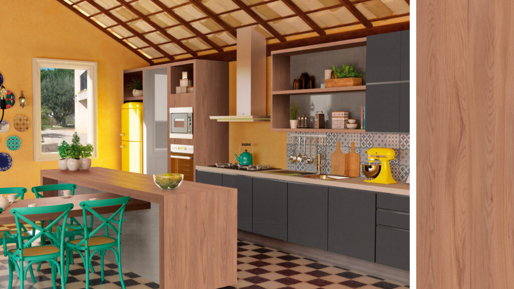 O padrão Lâmina Naturalle reproduz uma madeira média, com veios bem homogêneos e subtom quente. É um painel que permite uma extensa gama de possibilidades de combinações, desde as lacas mais coloridas e metálicas, até os padrões com acabamento BP.